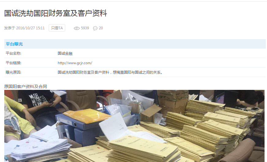 更为惊人的消息是,国阳财富宣布停止兑付后,囯诚金融的金黎珏曾指使数名黑衣人侵入国阳财富财务室,抢走财务人员的手机、提包(内有国阳财富财务资料备份的移动U盘),拆除安装在国阳财富的摄像头后又攫取国阳财富的全部财务资料、财务室的电脑、备份硬盘,疑似“掩盖其为非吸主体及建有资金池”。巧合的是,曾有投资者在论坛发帖称“国诚洗劫国阳财务室及客户资料”。