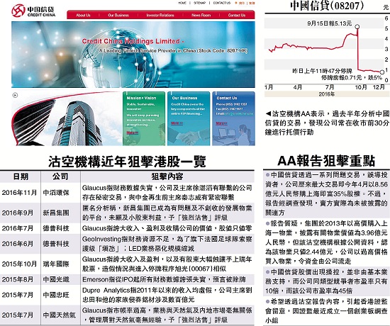 沽空机构AA首次针对创业板公司发表报告,过往AA只针对本港主板上市的公司,以及美国上市公司,今次是首次针对流通量低的创业板公司。该报告指出,在该公司过去的交易中,涉及隐瞒关连交易;以高于市值价买入物业,但夸大该物业的价值,以增加公司的盈利;怀疑公司于过去半年常在收市前30分钟进行托价行动,因而认为中国信贷股价主要依赖操控,而非取决于公司基本面。AA认为公司股价只值0.17元,较报告公布前的收市价0.75元低77%。