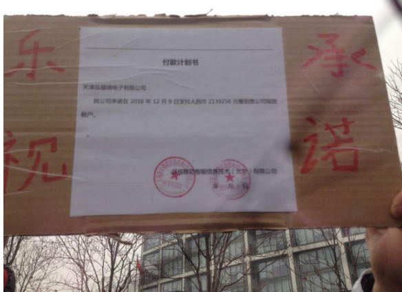 北京时间记者在现场看到了几份“付款计划书”复印件,据复印件显示:乐视移动智能信息技术(北京)有限公司承诺在2016年12月9日支付人民币2139256元整到天津泓福瑞电子有限公司指定账户,并加盖了乐视移动智能信息技术(北京)有限公司的财务专用章。