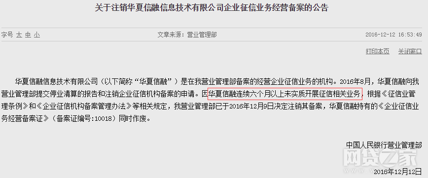 网络整理 2021-03-22 23:24网贷之家综合 12月12日,中国人民银行营业管理部(北京)官方网站发布公告,称该部已于2016年12月9日注销了华夏信融和望洲征信两家公司的持有的 《企业征信业务经营备案证》,因两家公司连续6个月以上未实质开展征信相关业务。