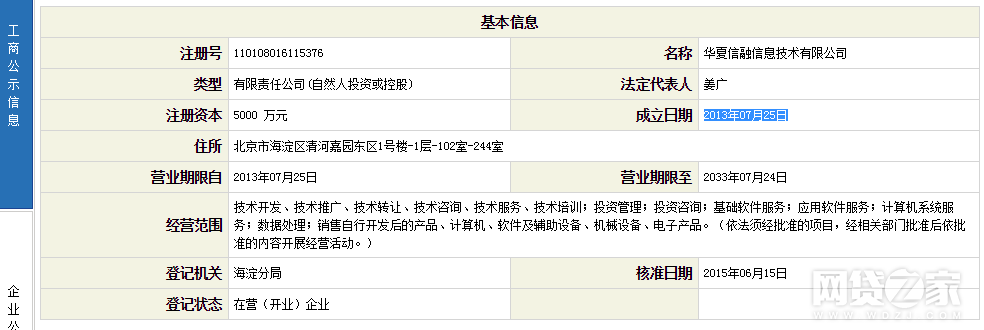 公开资料显示,此次被注销企业征信备案资格的华夏信融信息技术有限公司是一家“信用信息”服务提供商,注册资本人民币5000万元,成立于2013年07月25日,总部设在北京。