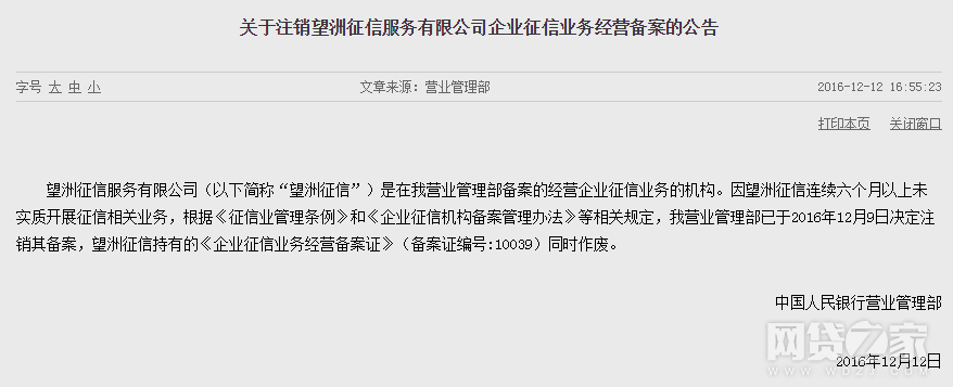 转载请标注:信息网——央行宣布注销望洲征信等两家企业征信备案资格