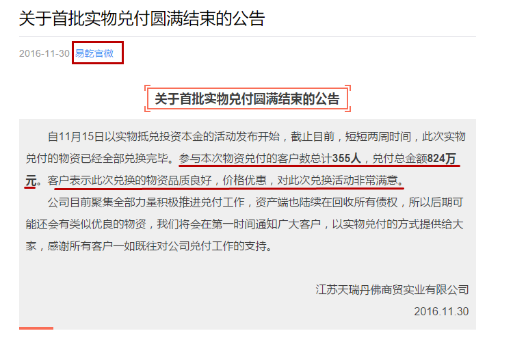 11月30日,易乾财富官方微信公布了《关于首批实物兑付圆满结束的公告》,公告中表示参与本次物资兑付的客户数总计355人,兑付总金额824万元。客户表示此次兑换的物资品质良好,价格优惠,对此次兑换活动非常满意。