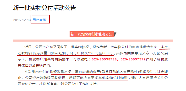 12月13日,易乾财富官方微信发布了《新一批实物兑付活动公告》(以下简称《公告》)。