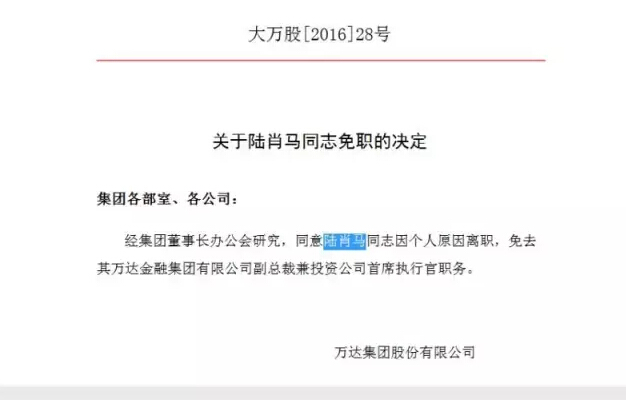 据微信公众号商业地产头条,万达金融集团有限公司副总裁兼投资公司首席执行官陆肖马因个人原因离职。万达集团同意其离职,免去其万达金融集团有限公司副总裁兼投资公司首席执行官职务。