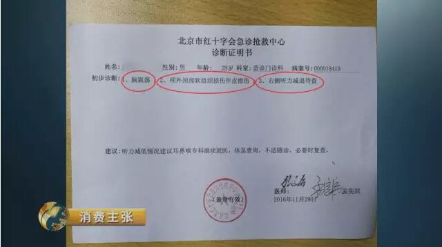 在刘先生提供的一份北京市红十字会急诊抢救中心出具的诊断证明书上,我们看到,刘先生被初步诊断为脑震荡、颅外颈部软组织损伤,伴皮擦伤。右侧听力减退待查。