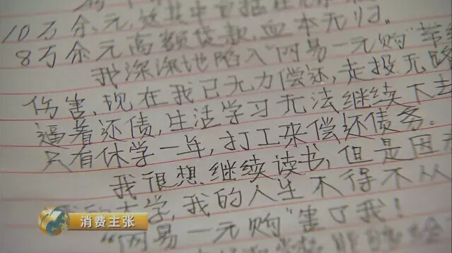 我很想继续读书,但是因为网易一元购,我的大学、我的人生不得不从此改变。网易一元购害了我!希望老师和学校能够给我一个机会,一年之后,我还想继续读书!