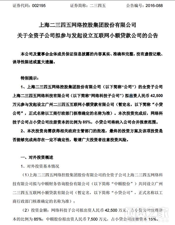 转载请标注:信息网——上市公司二三四五出资4.25亿设立互联网小贷