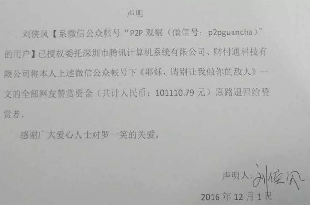 刘侠风【系微信公众帐号“P2P观察”的用户】已授权委托深圳市腾讯计算机系统有限公司、财付通科技有限公司将本人上述微信公众帐号下《耶稣,请别让我做你的敌人》一文的全部网友赞赏资金(共计人民币:101110.79元)原路退回给赞赏者。