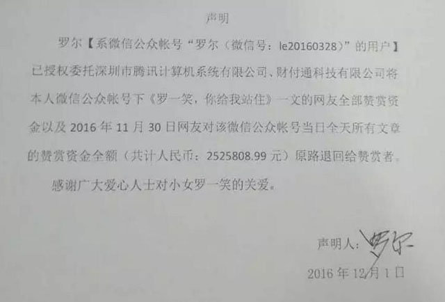 罗尔【系微信公众帐号“罗尔”的用户】已授权委托深圳市腾讯计算机系统有限公司、财付通科技有限公司将本人微信公众帐号下《罗一笑,你给我站住》一文的网友全部赞赏资金以及2016年11月30日网友对该微信公众帐号当日全天所有文章的赞赏资金全额(共计人民币:2525808.99元)原路退回给赞赏者。