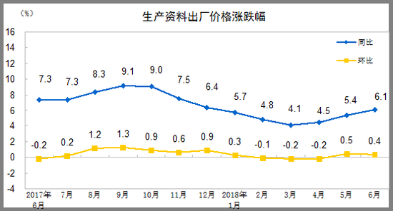 2018年6月份,全国工业生产者出厂价格同比上涨4.7%,环比上涨0.3%。工业生产者购进价格同比上涨5.1%,环比上涨0.4%。上半年,工业生产者出厂价格比去年同期上涨3.9%,工业生产者购进价格上涨4.4%。