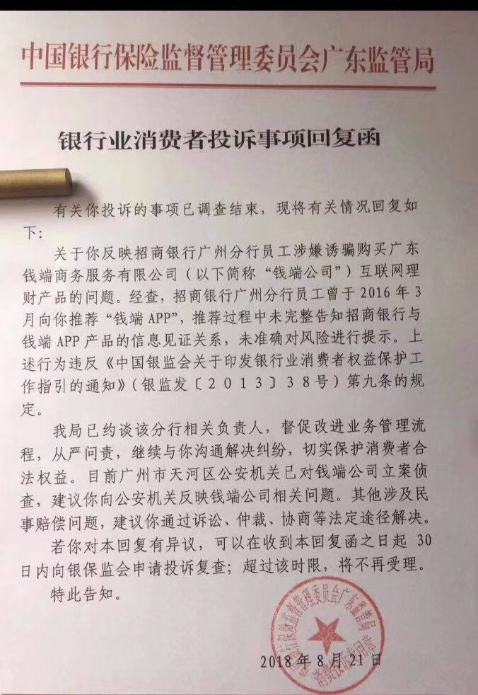 回复函中提到,关于用户反映招商银行广州分行员工涉嫌诱骗购买广东钱端商务服务有限公司(以下简称“钱端公司”)互联网理财产品的问题。经查,招商银行广州分行员工曾于2016年3月向用户推荐“钱端APP”,推荐过程中未完整告知招商银行与钱端APP产品的信息见证关系,未准确对风险进行提示。上述行为违反《中国银监会关于印发银行业消费者权益保护工作指引的通知》(银监发〔2013〕38号)第九条的规定。